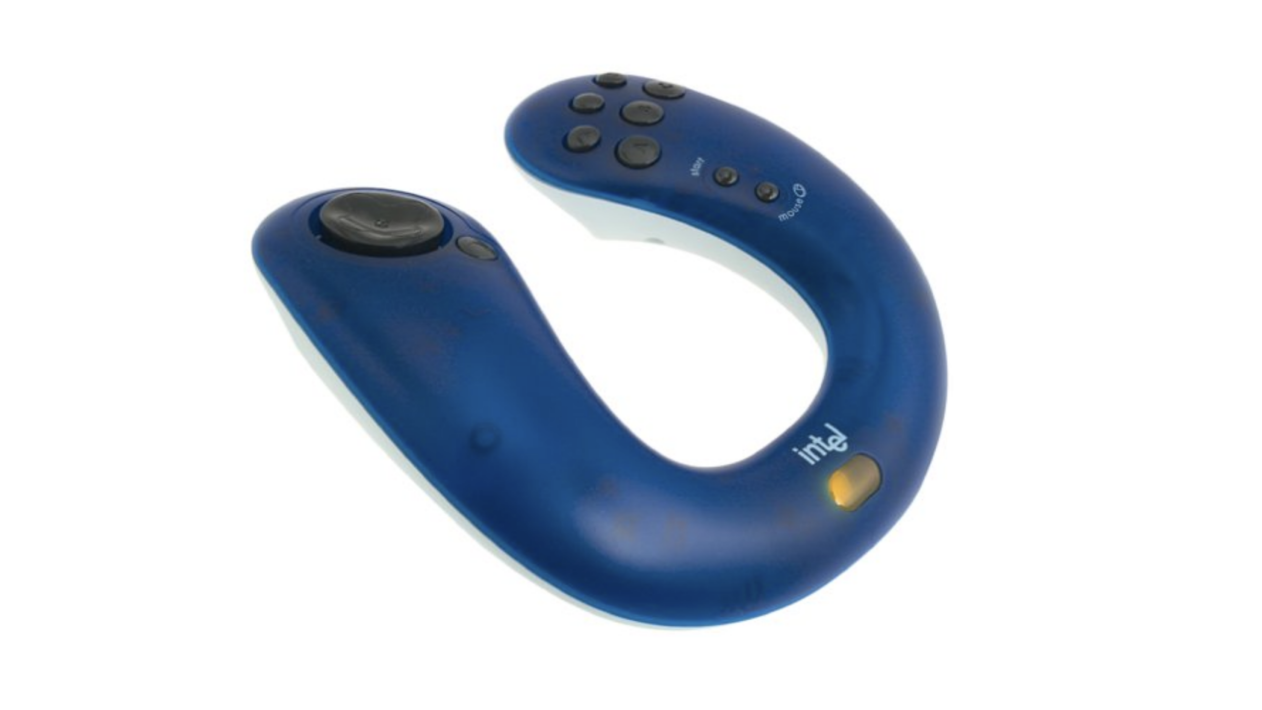 First appearing in 1999, this unconventional peripheral featured a unique U-shaped chassis designed for early motion-controlled PC gaming. Lacking traditional joysticks, the hardware relied on tilting the entire unit to navigate through flight and racing simulators of the late nineties. This wireless digital device represents a rare venture into consumer gaming hardware by Intel before the industry shifted toward standardized analog sticks.