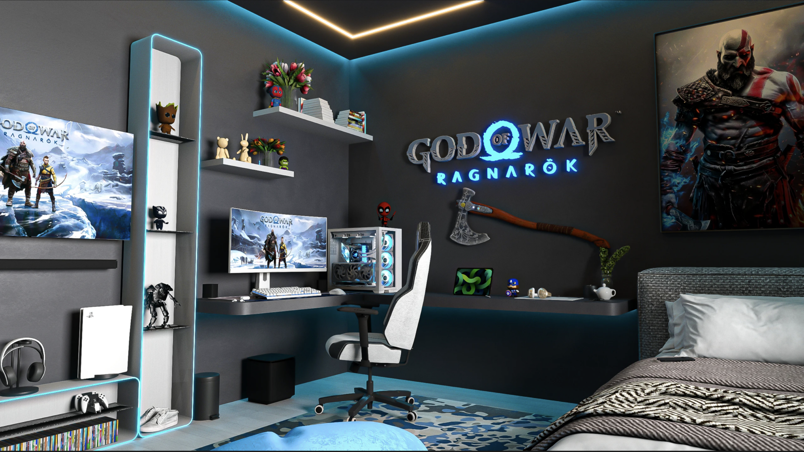 Inspired by the epic world of God of War Ragnarök, this gaming room blends sleek modern design with Norse mythology. The glowing wall logo, Leviathan Axe display, and Kratos artwork instantly set the tone. RGB lighting and a powerful PC setup complete a space built for immersive gameplay.