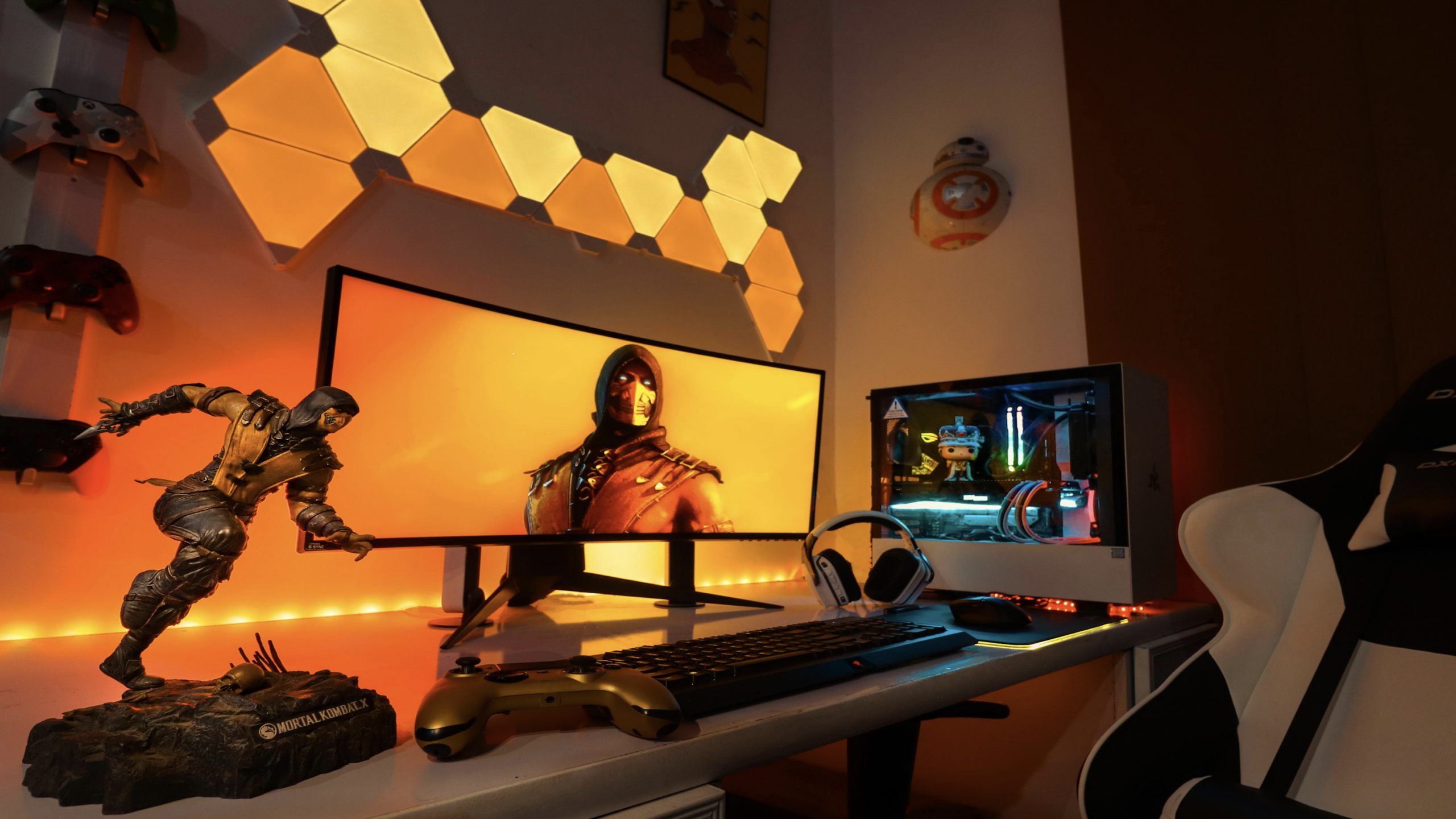 Warm amber lighting from hexagonal wall panels casts a fierce glow over a high-end ultrawide setup guarded by a detailed Scorpion statue. The minimalist white desk contrasts with the aggressive orange theme, highlighting a liquid-cooled PC rig and specialized fighting game controllers. It’s a clean, modern tribute to the franchise’s brutal legacy, where every element is fine-tuned for perfect frame-data execution.