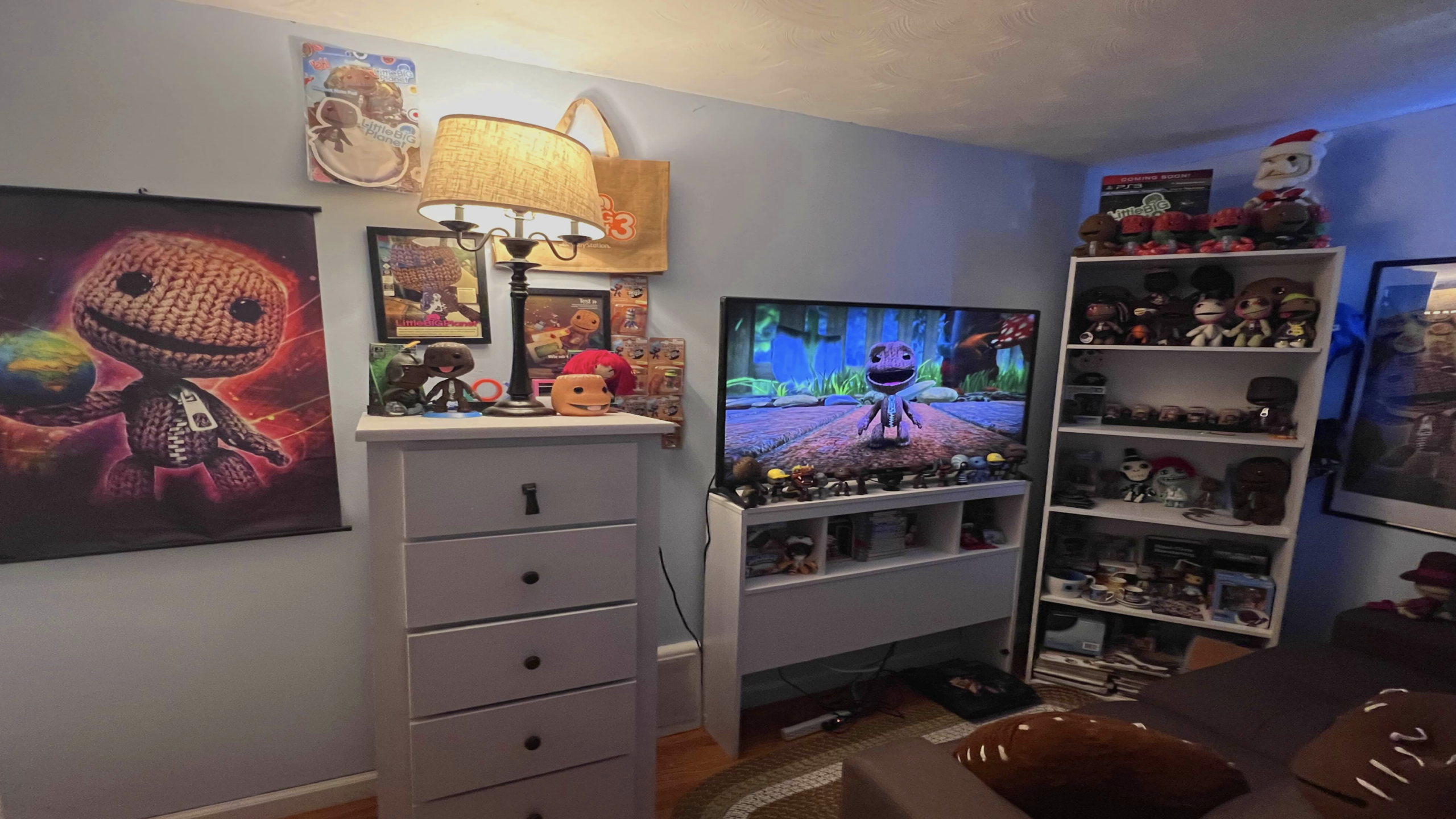 Plush textures and soft blue walls create a tactile haven filled with knitted dolls and handmade charms that mirror the whimsical charm of LittleBigPlanet. A dedicated shelving unit displays a vast collection of Sackboy variants, while a warm desk lamp illuminates colorful posters of the iconic stitched protagonist. This imaginative space feels like a physical extension of a Creative Mode level, perfect for fans who value the playful spirit of the PlayStation classic.