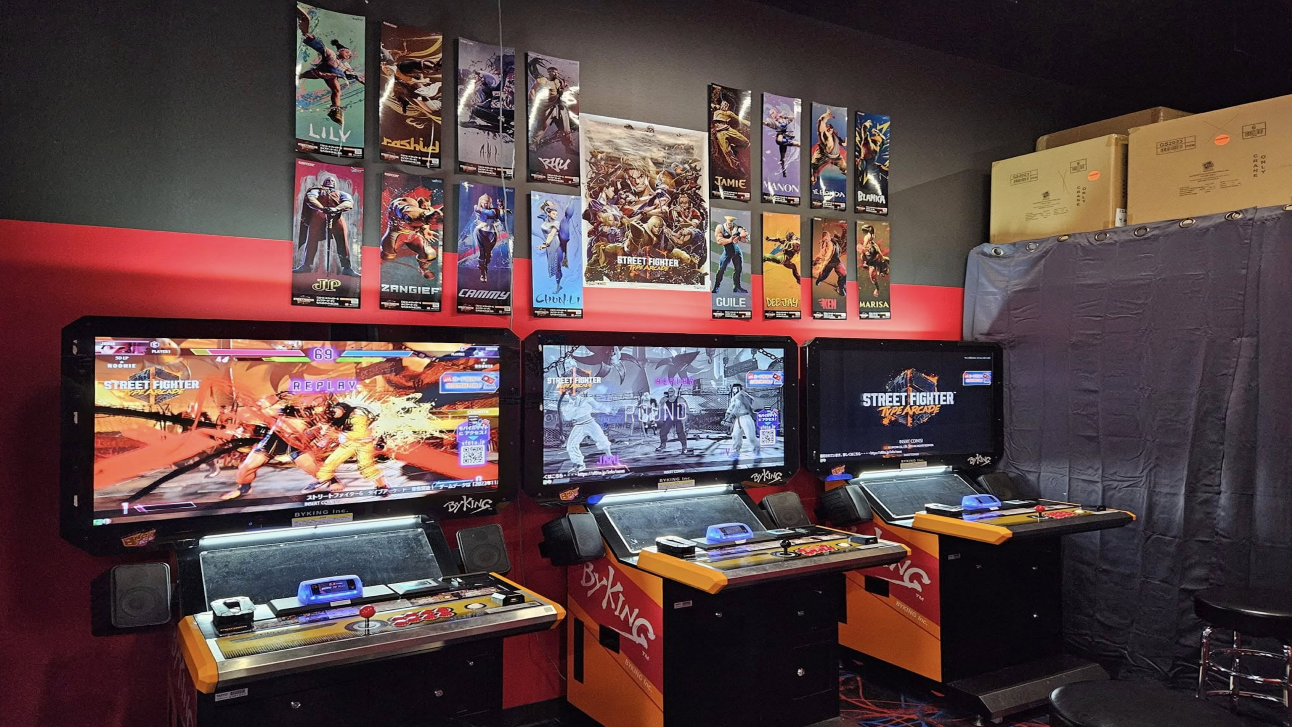 Rows of authentic “Byking” cabinets bring the electric atmosphere of a Japanese game center home, featuring a red-and-black aesthetic that screams competitive intensity. The walls are lined with character-specific posters showcasing the full roster from Ryu to Marisa, creating a high-stakes environment for local versus matches. It is a pro-tier setup designed for frame-perfect inputs and endless rounds of legendary fighting game history.