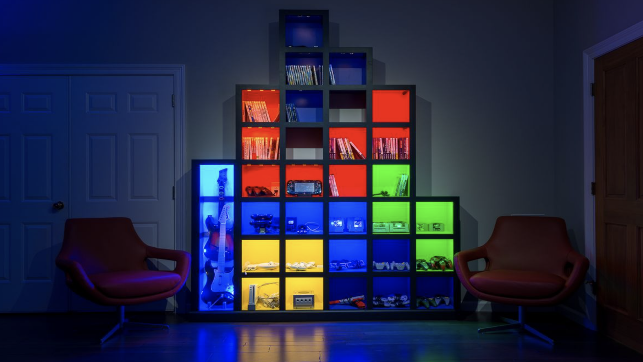 Vibrant Primary colors and backlit shelving units form a striking silhouette that honors the world’s most famous puzzle game through clean, organized lines. The block-style arrangement holds an impressive collection of retro consoles and physical media, organized by color to maintain a perfect “Tetrimino” aesthetic.