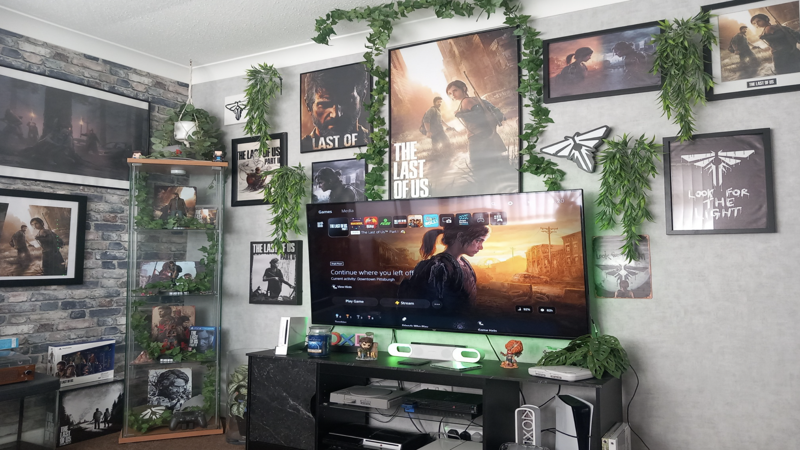 Industrial brickwork meets creeping ivy in a meticulously detailed setup that captures the haunting beauty of Ellie’s journey through a reclaimed world. Firefly emblems and weathered canvas prints surround a modern display, blending high-end tech with the gritty, rustic feel of the survival-horror masterpiece.