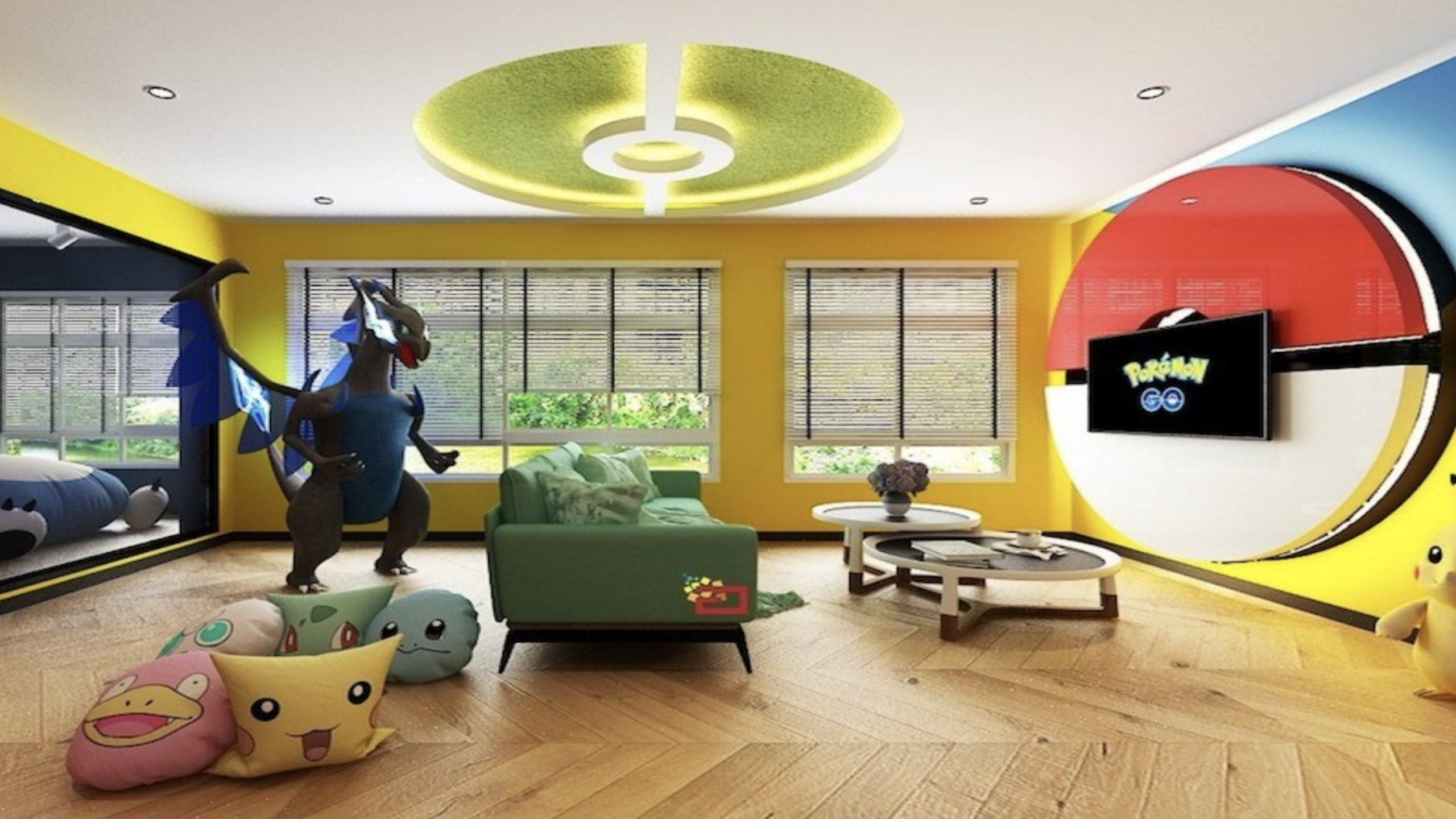 Bright yellow walls and a massive Pokéball-shaped TV mount transform this living space into a high-energy trainer’s headquarters. A life-sized Charizard statue stands guard near Pokéball ceiling lights, while custom-shaped starter cushions like Squirtle and Bulbasaur add a soft, playful touch to the hardwood floors.