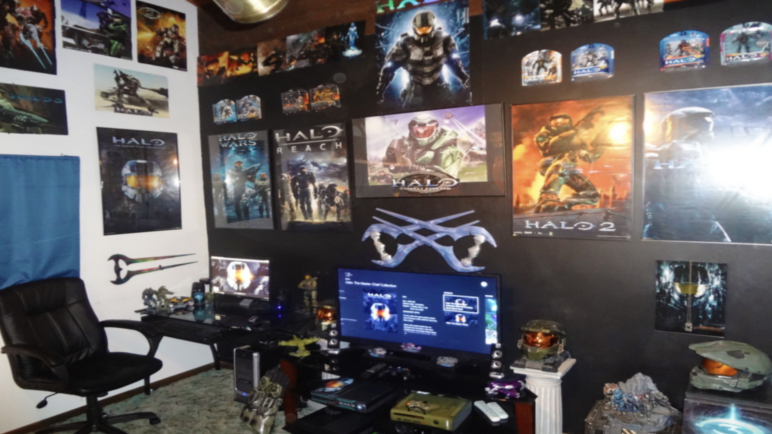 Jet-black walls serve as the perfect backdrop for an extensive armory of Energy Swords and Spartan helmets, celebrating two decades of legendary sci-fi combat. From the Master Chief Collection running on the main screen to the shelves packed with rare action figures, every inch of this den is dedicated to the UNSC’s greatest hero.