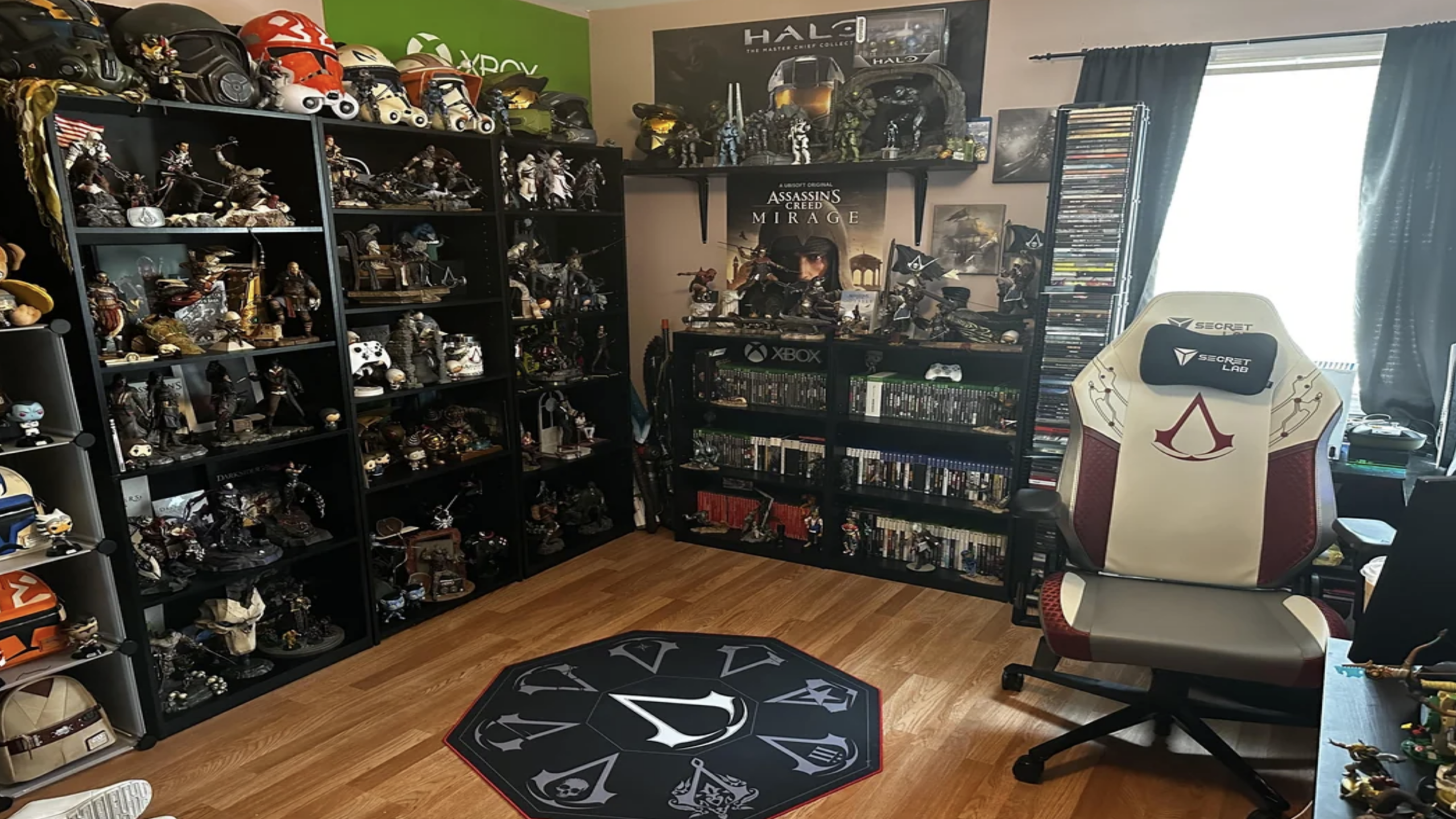 Towering black bookshelves house an incredible array of hooded protagonists and hidden blade replicas, creating a museum-grade tribute to history’s most secretive brotherhood. An octagonal Creed-crested rug anchors the room, perfectly complementing the specialized Secretlab gaming chair and expansive collection of physical Xbox media.
