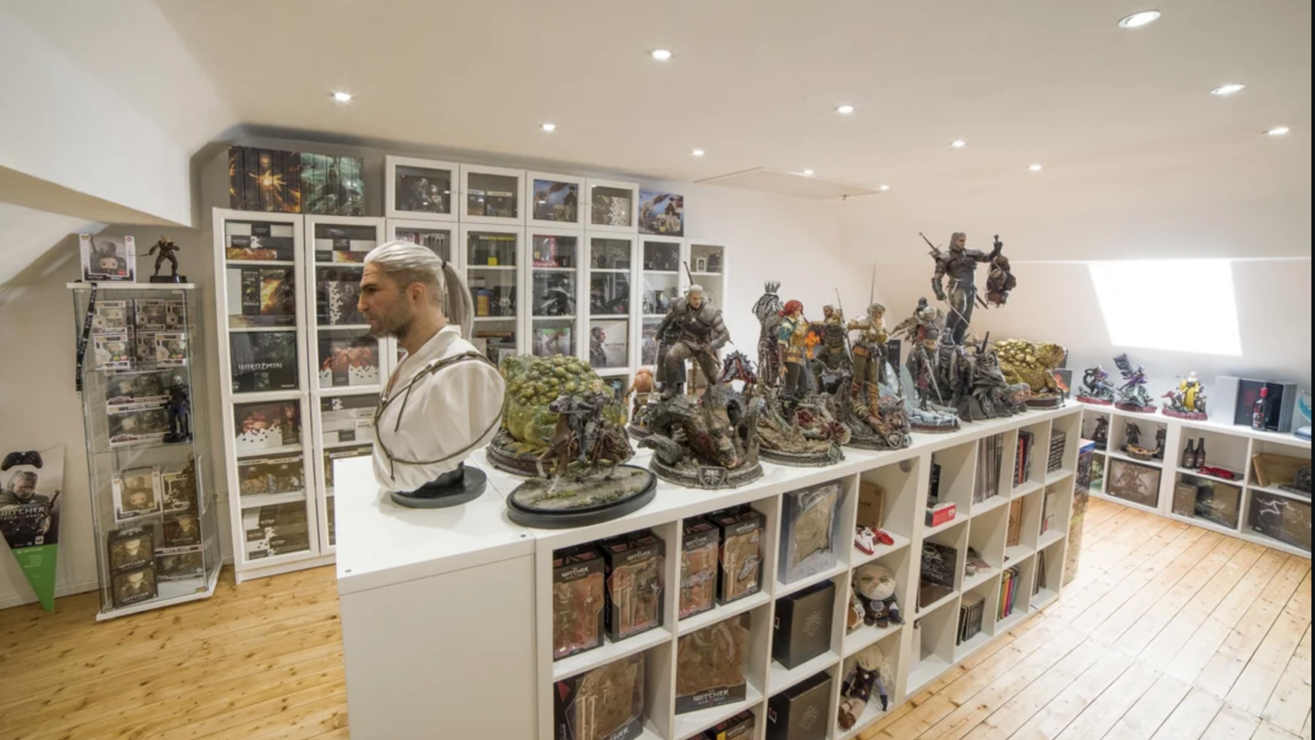 Museum-style glass cabinets and pristine white shelving display a vast collection of Geralt of Rivia’s most dangerous encounters and legendary gear. A hyper-realistic bust of the White Wolf serves as the centerpiece, surrounded by premium statues and art books that document the gritty beauty of the Continent. The clean, bright aesthetic highlights the intricate craftsmanship of each collectible, making this library the ultimate destination for any serious fan of the Northern Realms.