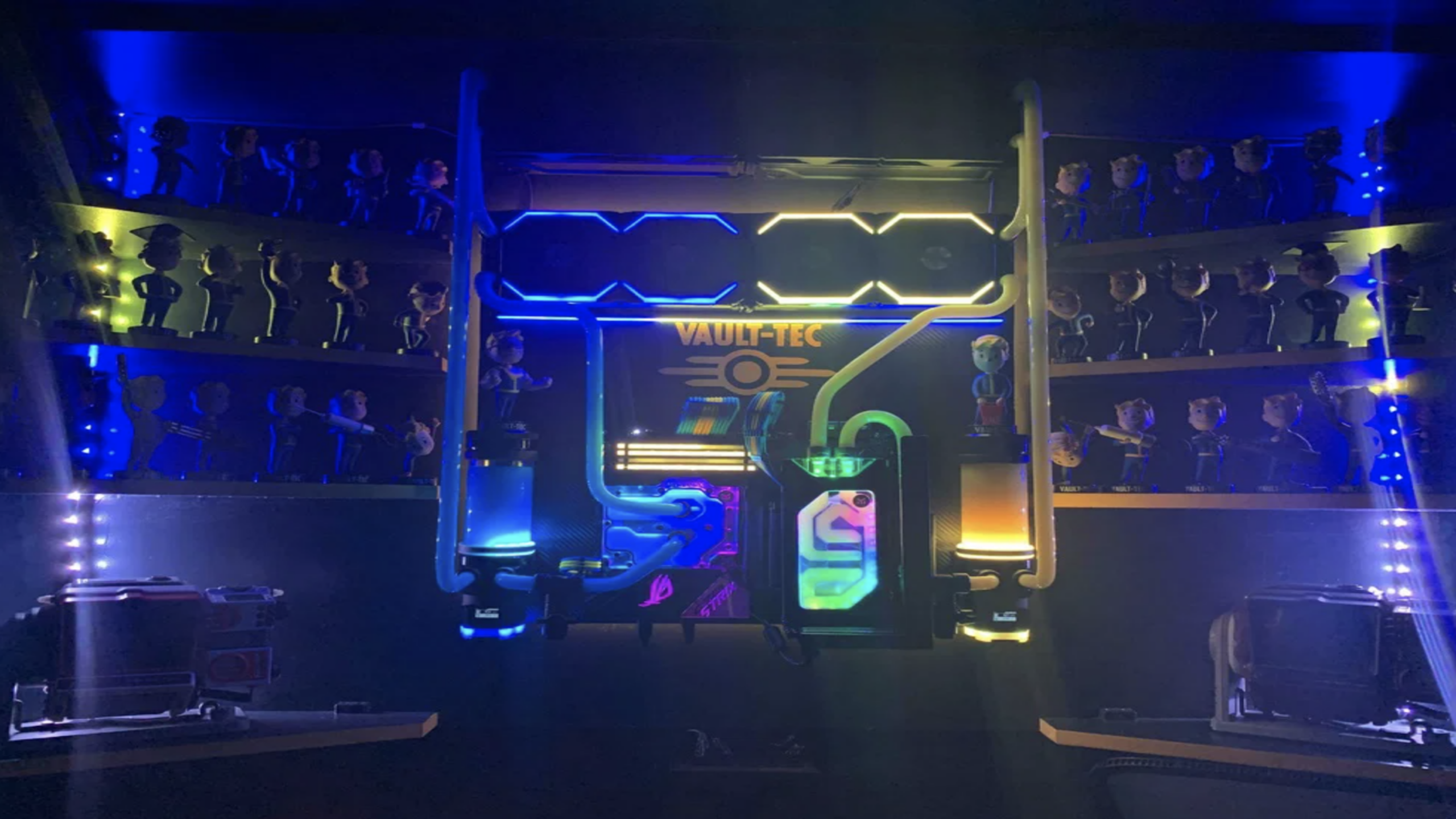 Glowing blue and amber coolant tubes weave through a custom-built PC rig that looks like it was salvaged straight from a high-tech underground bunker. Shelves lined with iconic Vault Boy bobbleheads and Pip-Boy replicas surround the glowing hardware, illuminating the dark workspace with a post-apocalyptic radioactive shimmer.