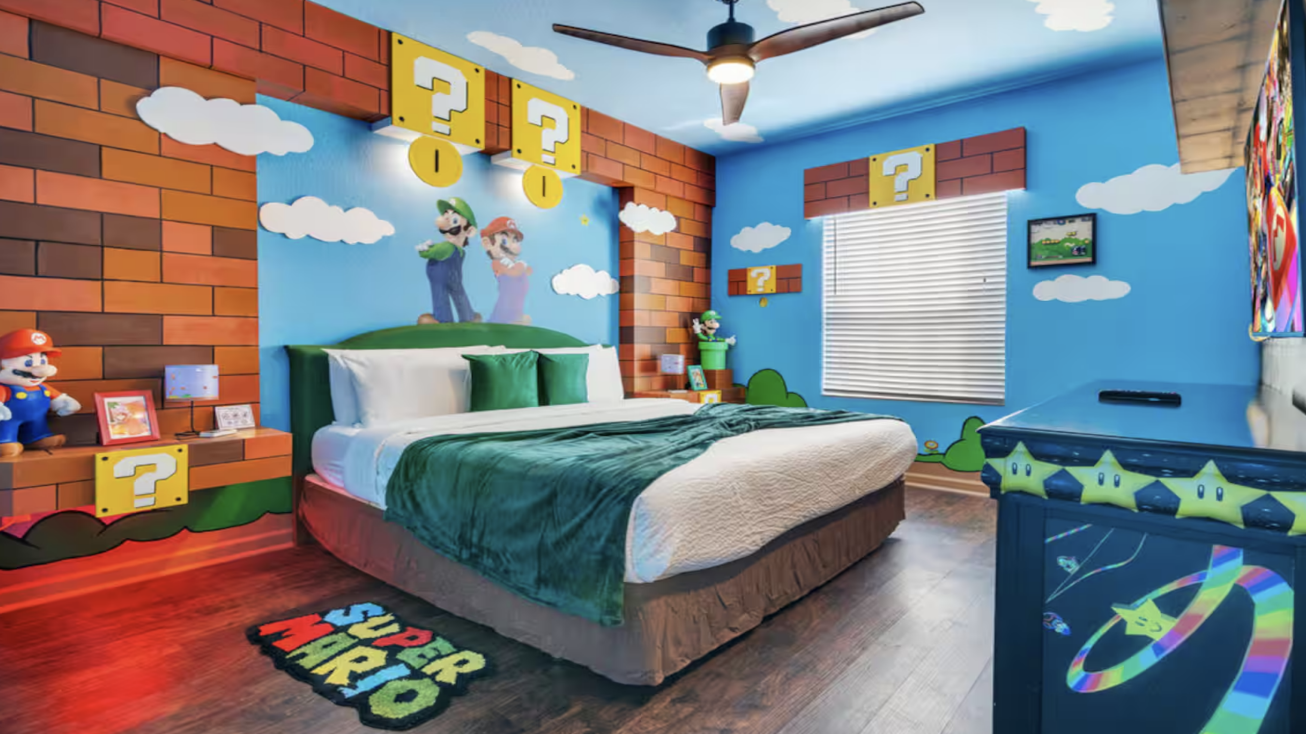 Inspired by the colorful universe of Super Mario Bros., this bedroom recreates the Mushroom Kingdom with brick blocks, clouds, and question mark boxes. Mario and Luigi artwork above the bed becomes the focal point. Bright colors and themed decor make the room feel like a real-life game level.