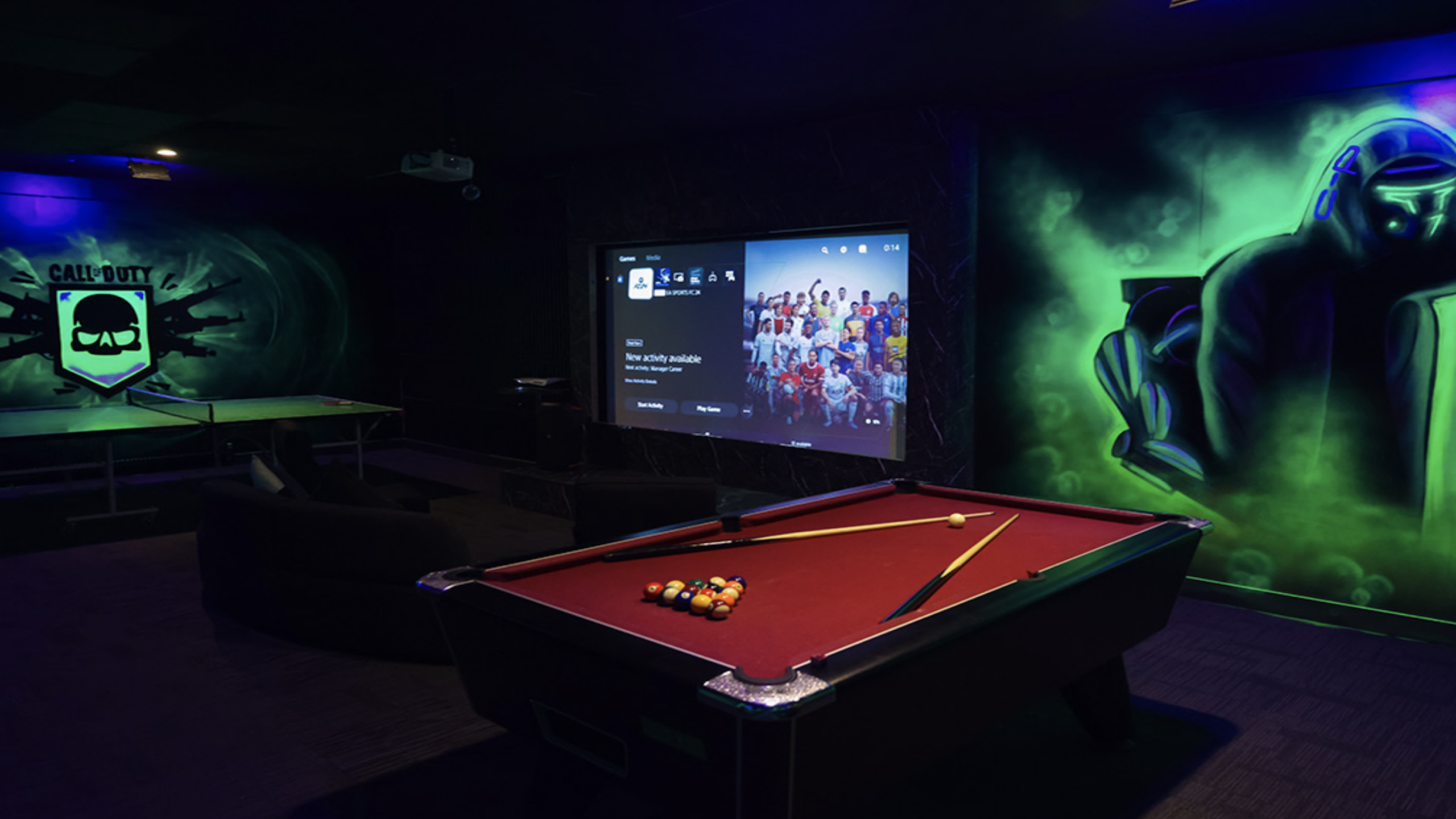This dark gaming lounge captures the tactical vibe of Call of Duty with moody green lighting and military-inspired wall art. A massive projection screen turns the room into a private multiplayer arena. The pool table adds a social element, perfect for competitive game nights.