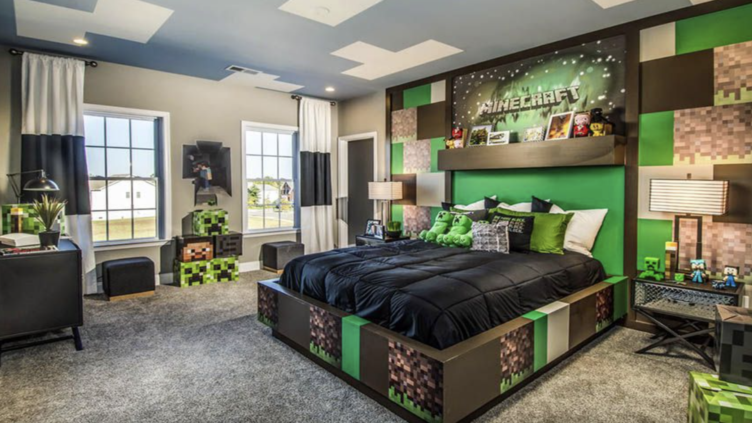 Pixel-style textures, Creeper accents, and cube-inspired furniture capture the game’s signature aesthetic. The green palette and playful design make it a dream space for any Minecraft fan.