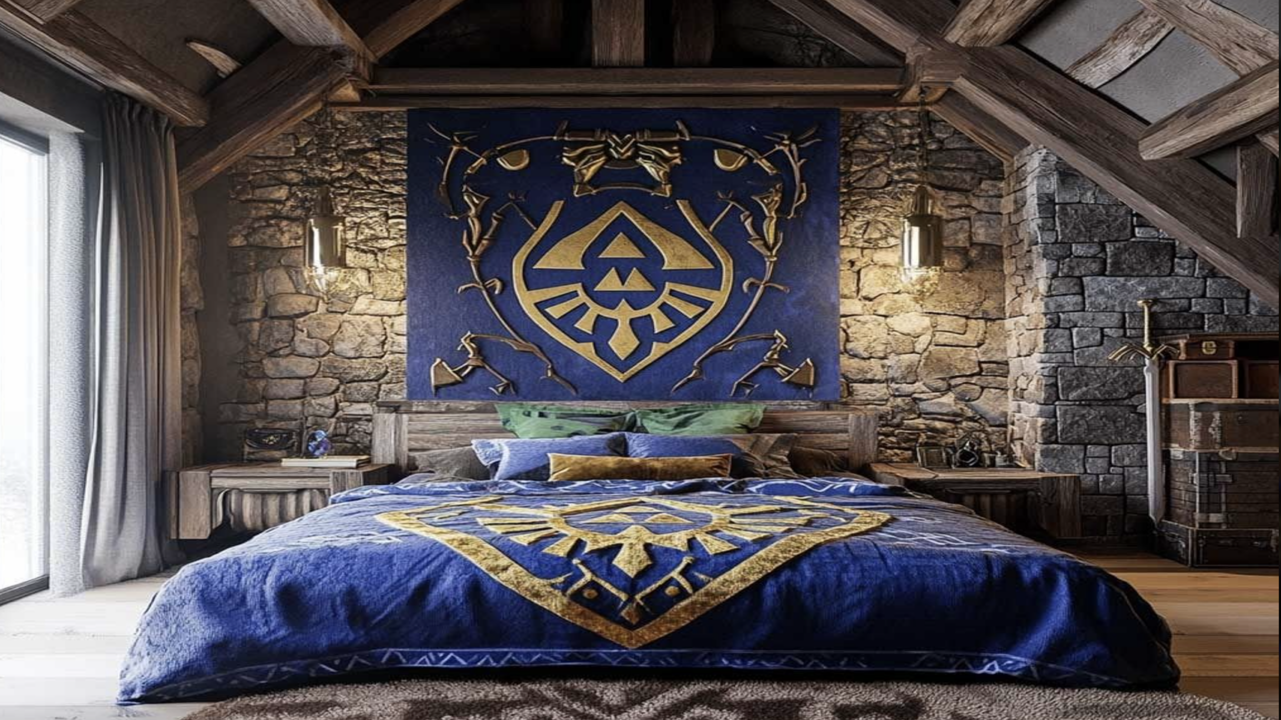Rustic stonework and hand-carved timber beams recreate the atmosphere of a Link-inspired stable right in the heart of Hyrule. The centerpiece features a massive royal blue tapestry and matching bedding emblazoned with the iconic golden Triforce and crest. Every corner of this medieval refuge feels legendary, complete with a Master Sword replica resting against a traveler’s chest.