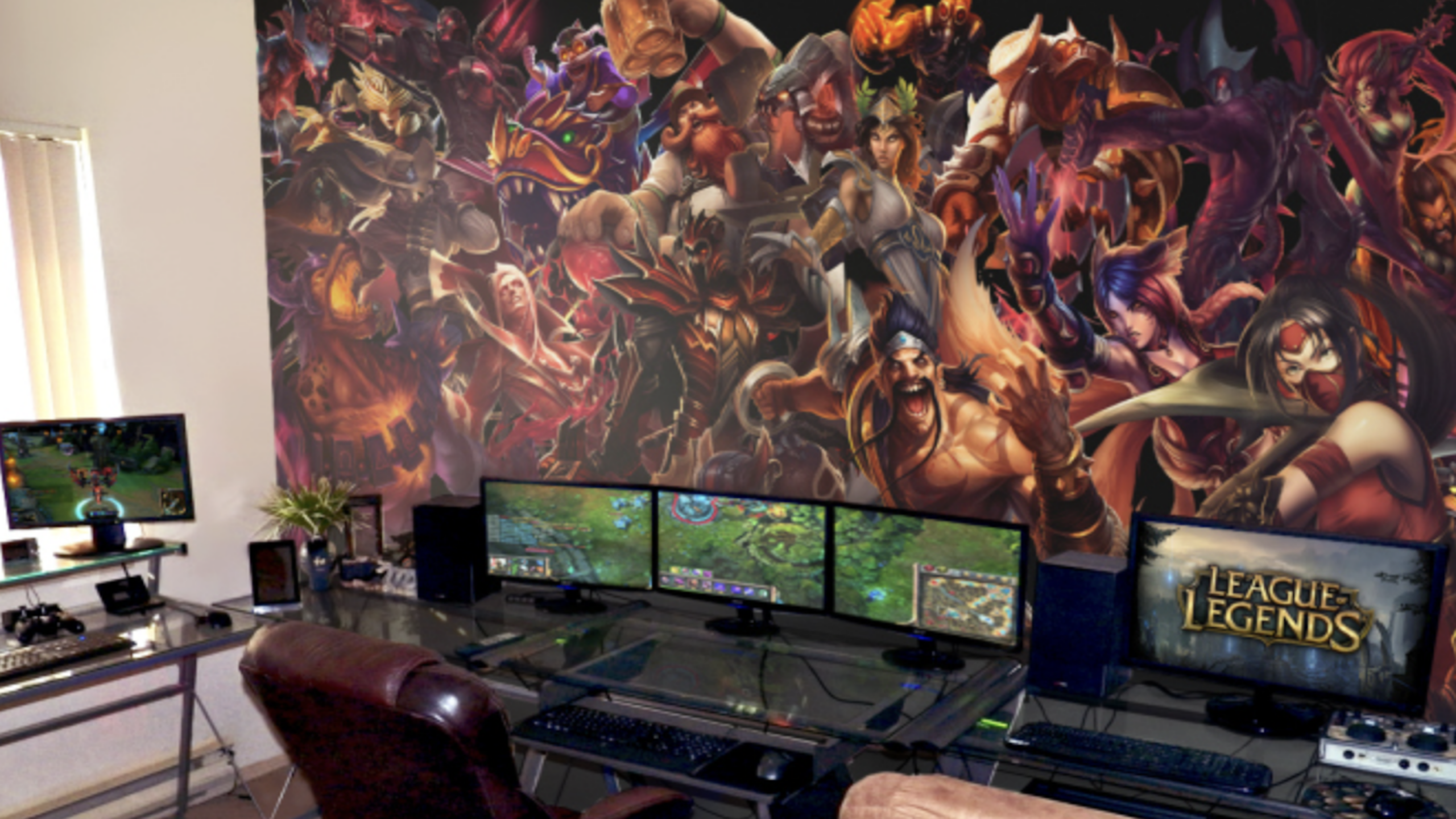 Four high-definition monitors create a seamless panoramic command center designed for absolute map awareness during high-stakes ranked matches. A sprawling wall mural showcases a massive roster of champions like Draven and Akali, bringing the vibrant energy of the League into the workspace.