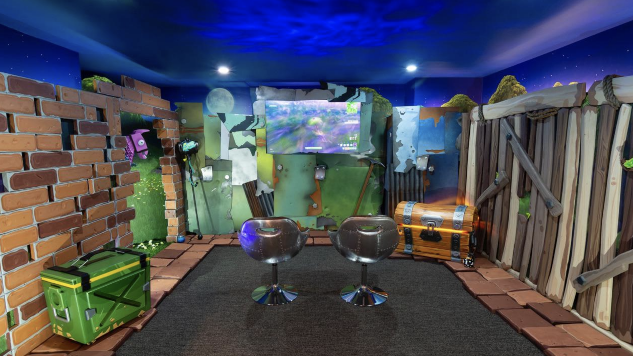 Vibrant 3D wall panels and textured brickwork transform a standard room into a life-sized recreation of the island’s most iconic landing spots. From the glowing loot chest to the Supply Llama peeking through the doorway, every detail captures the colorful, high-octane aesthetic of the world’s biggest battle royale. The ceiling mimics a deep night sky, providing the perfect immersive backdrop for hunting down that final elimination.