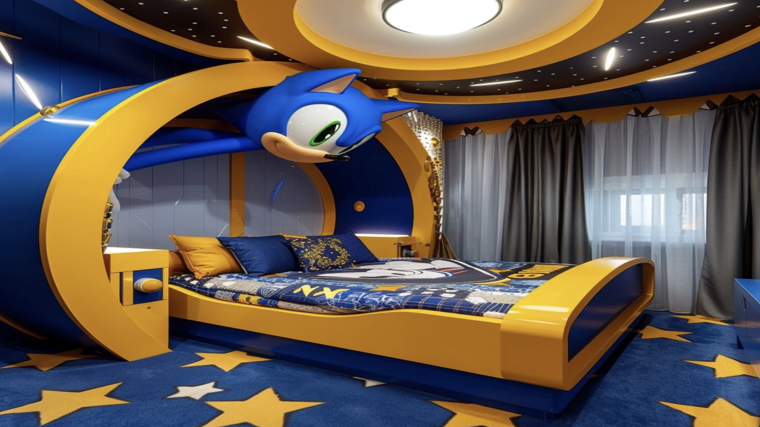 Bold blue and yellow curves wrap around the bed frame to simulate the gravity-defying loops of Green Hill Zone at breakneck speeds. Star-patterned carpets and a giant 3D Sonic figure emerging from the wall create a nostalgic playground for fans of the world’s fastest hedgehog. This high-energy design uses integrated LED lighting to make the entire space feel like a frozen frame from a classic Sega adventure.