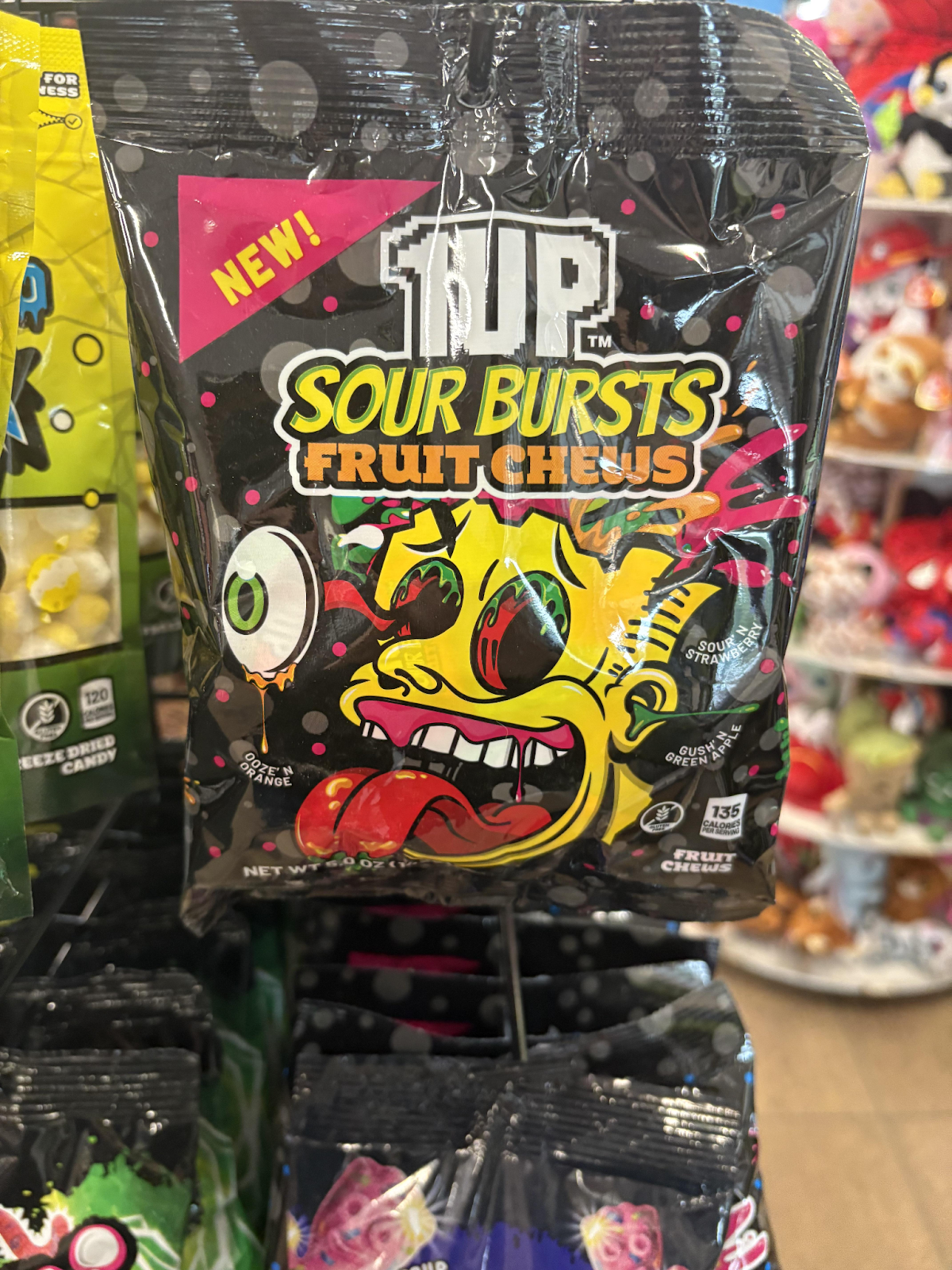 The product line includes gummy candy and flavored sweets, sold in brightly colored packaging referencing classic video-game imagery.